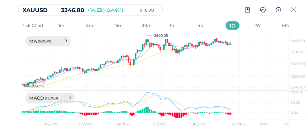 黄金在日线图上呈现出多空犹豫状态,短期价格震荡加剧。MA(5)、MA(10)与MA(30) 三条均线正在汇聚,反映出市场短期方向不明。
