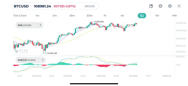从日线图来看,比特币在冲高回落后逐步企稳,并尝试恢复上涨动能。若能持续站稳在短期均线之上,将进一步增强多头信心。关键阻力位在111,975美元,若突破该水平,有望开启新一轮上涨;但若受阻回落,或将再次回测105,000至106,000美元区间的支撑带。