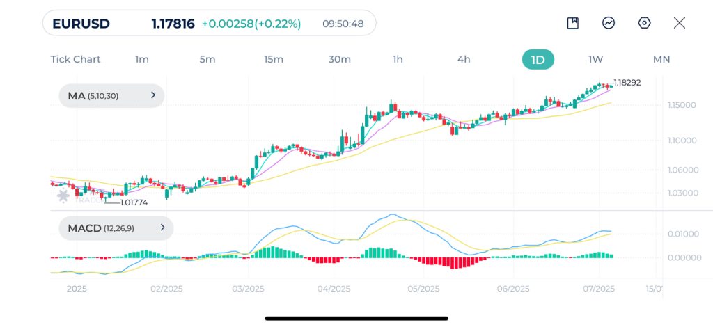整体动能偏向多头方向。只要汇价保持在1.1650上方,上行趋势将保持完好,短期内有望挑战1.1900关口。投资者应重点关注动态支撑——30日移动均线(MA30)。若价格回调至该支撑位但未有效跌破,或将成为多头再次发力的起点。