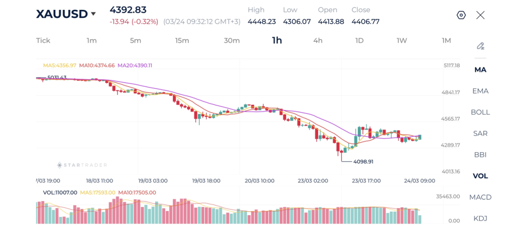 Vàng hiện đang giao dịch quanh mức 4.390 USD và biểu đồ cho thấy một xu hướng giảm ngắn hạn được thiết lập rõ ràng sau đợt bán tháo mạnh từ vùng 5.000 USD. Giá tiếp tục hình thành các đỉnh thấp hơn và đáy thấp hơn, xác nhận áp lực giảm duy trì.