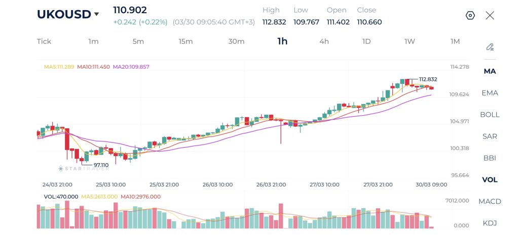 Dầu Brent đang giao dịch quanh mức $111 và vẫn duy trì cấu trúc tăng giá trong xu hướng lớn, dù gần đây có sự tích lũy quanh vùng đỉnh. Thị trường liên tục hình thành các đỉnh cao hơn và đáy cao hơn, được hỗ trợ bởi sự sắp xếp đi lên của các đường trung bình động, cho thấy áp lực mua vẫn bền vững.