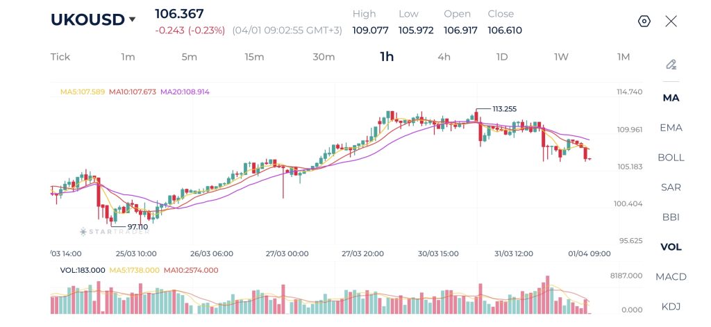 Dầu Brent hiện đang giao dịch quanh mức $106 trên khung thời gian 1 giờ (1H) và đang trong giai đoạn điều chỉnh rõ rệt sau đợt tăng giá mạnh trước đó hướng tới mức đỉnh $113,25.